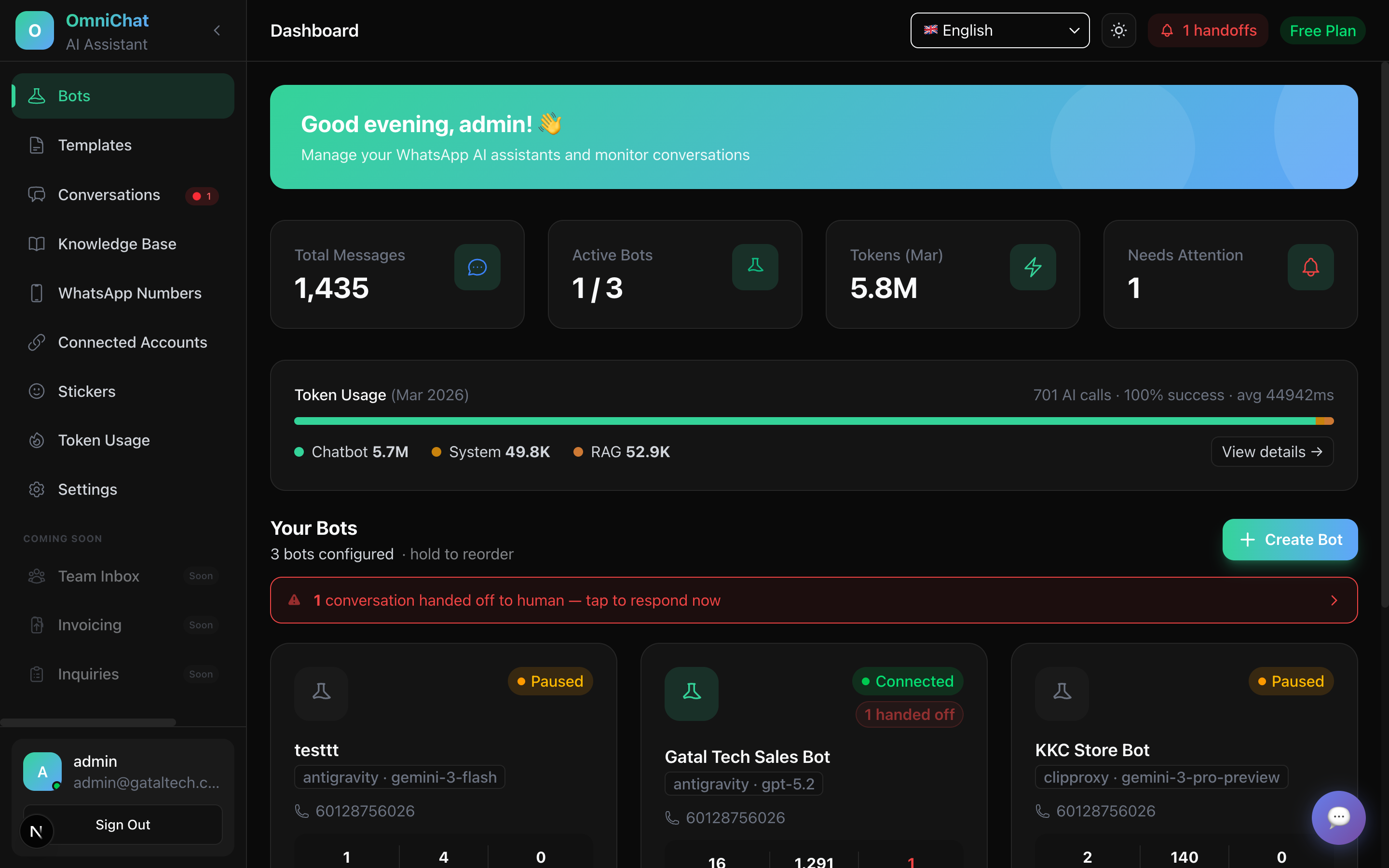 Track every AI token across all your bots. See costs in Malaysian Ringgit with daily and monthly breakdowns.